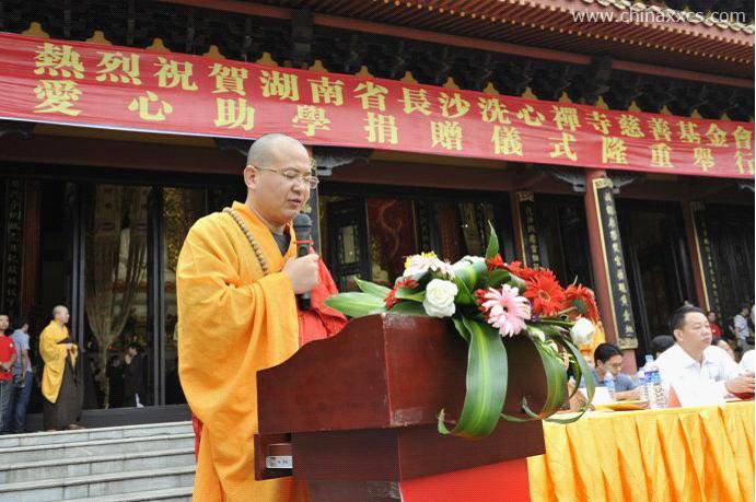 今天,是个吉祥殊胜的日子,我们在此隆重举行湖南省长沙洗心禅寺慈善基金会“万名学子助学计划”首届助学金捐赠仪式。我谨代表长沙洗心禅寺和洗心慈善基金会,向各位的到来,表示热烈的欢迎!