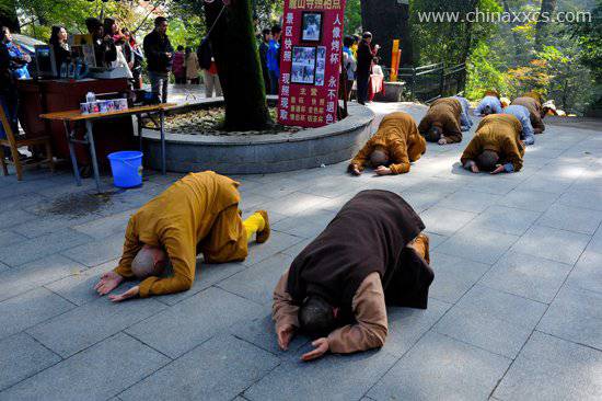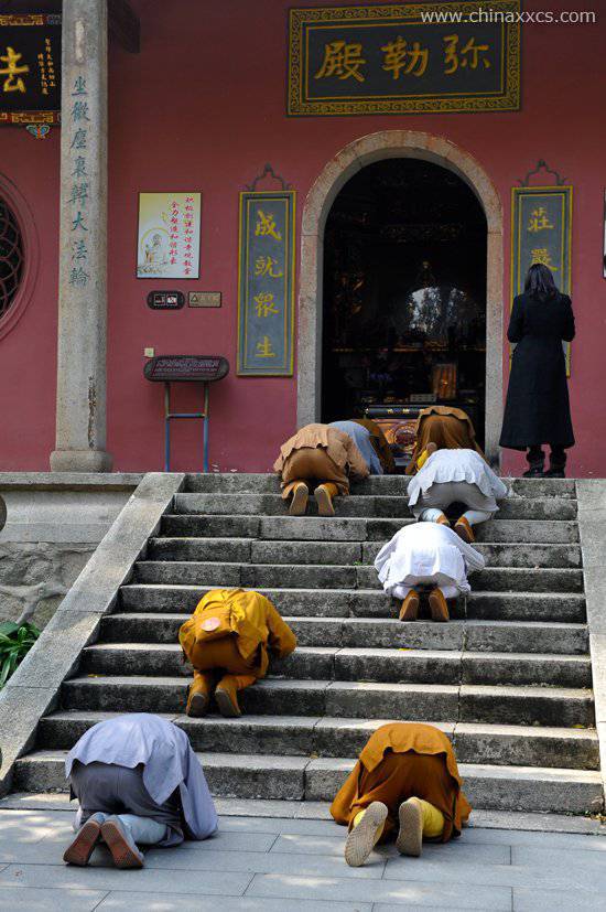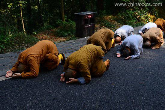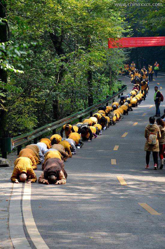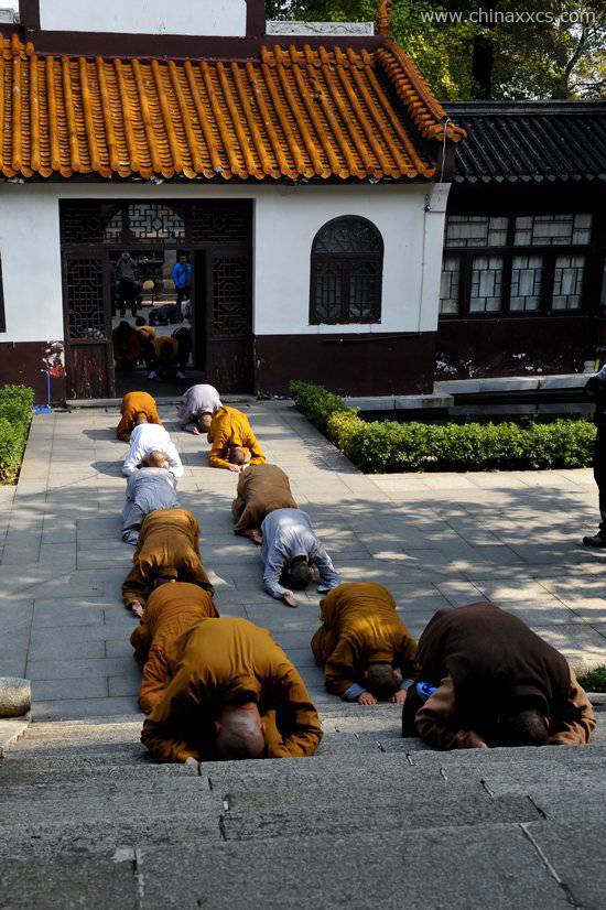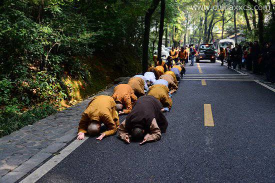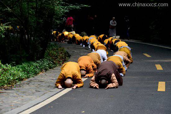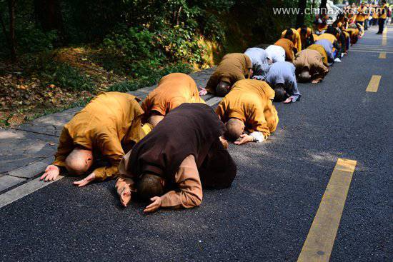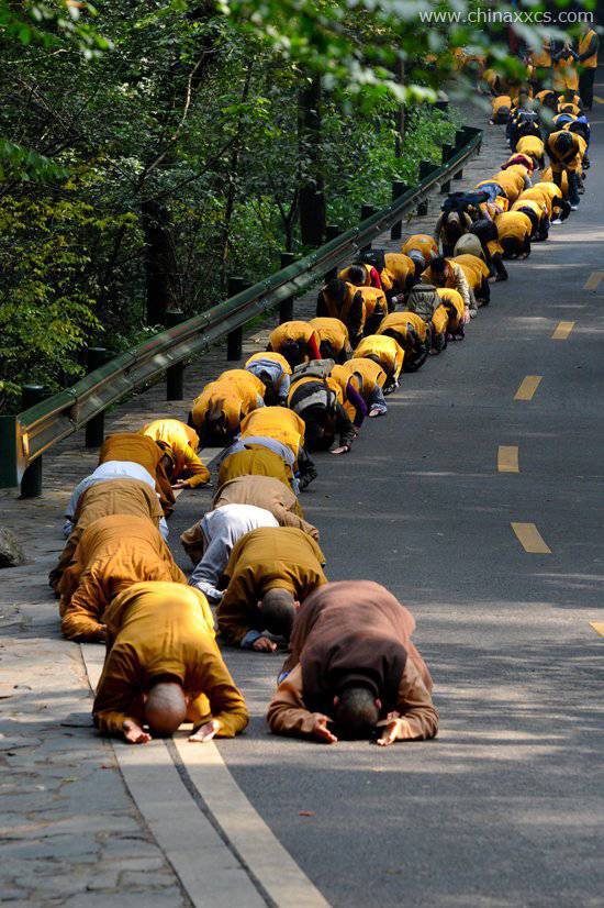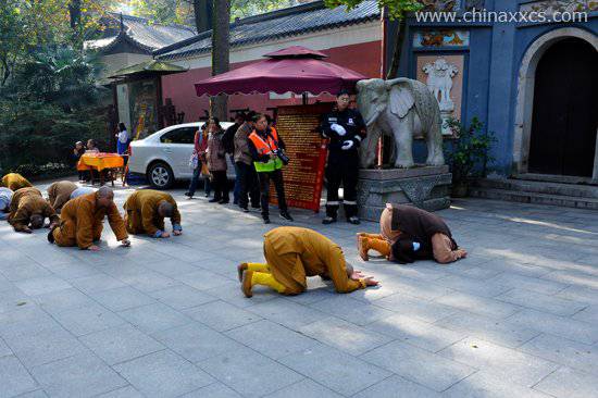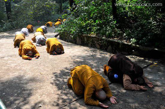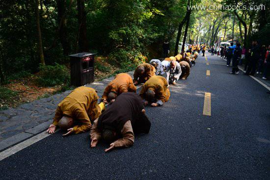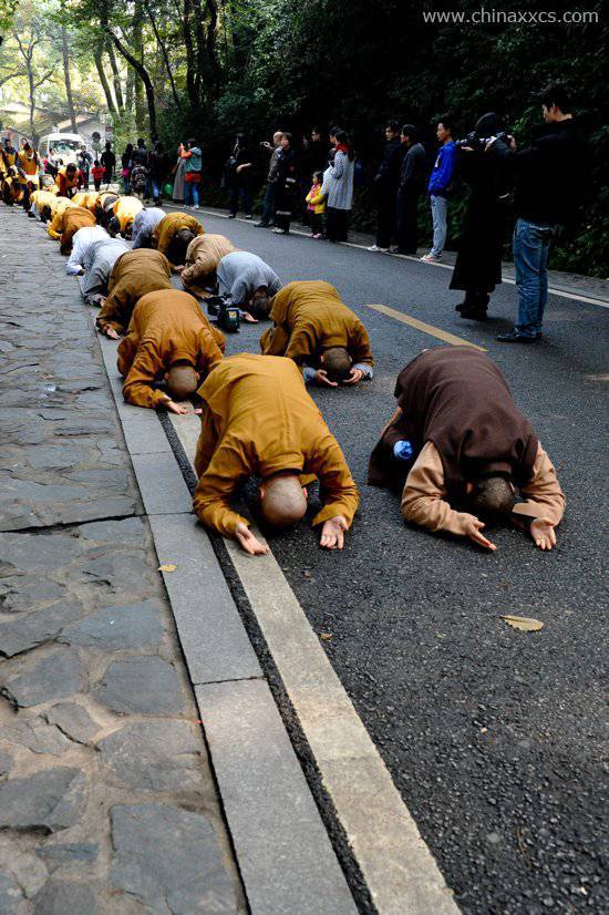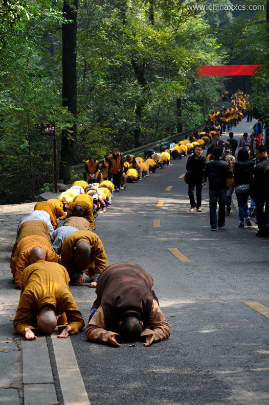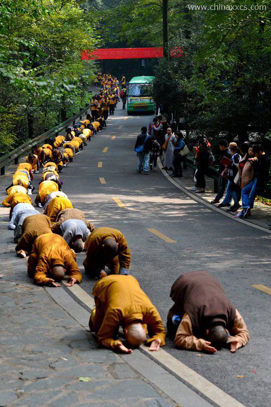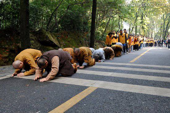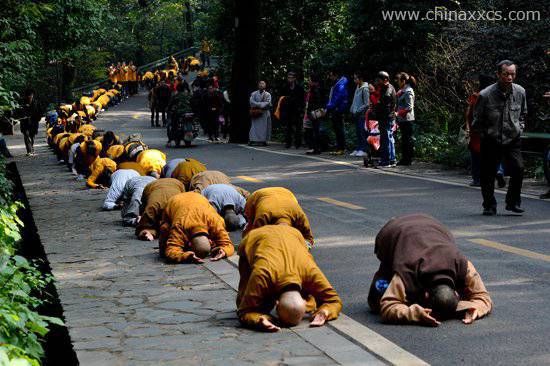 道圆法师和悉正法师领队,合十,虔诚礼拜。长长的队伍,无视周围或好奇或诧异的目光,超然物外,有条不紊地起起落落虔诚跪拜;此刻,世界是那么静谧,静得只听见自己的呼吸和回荡在心底的那一声佛号。