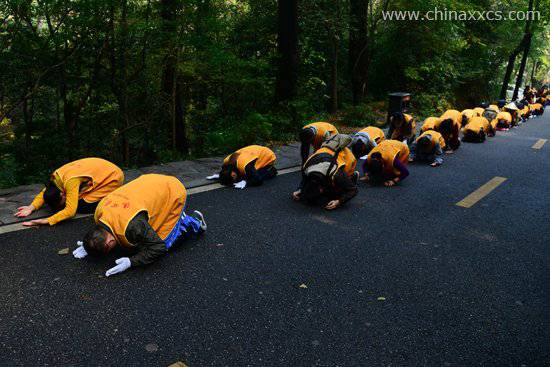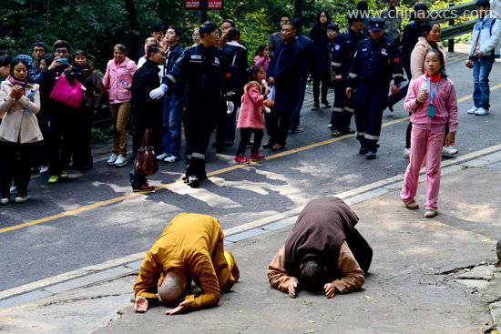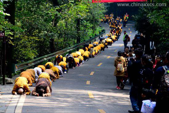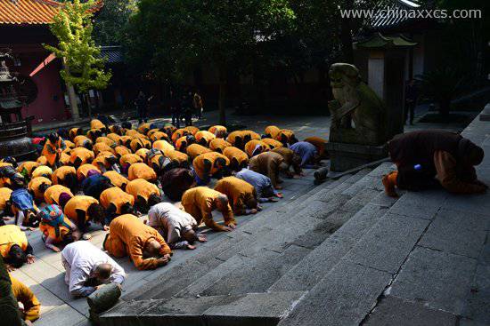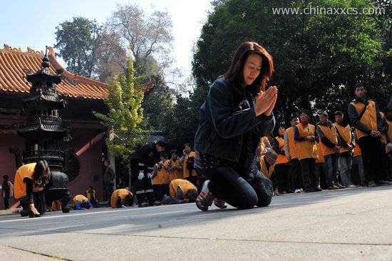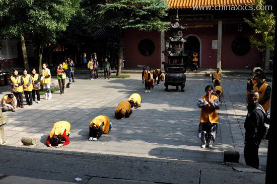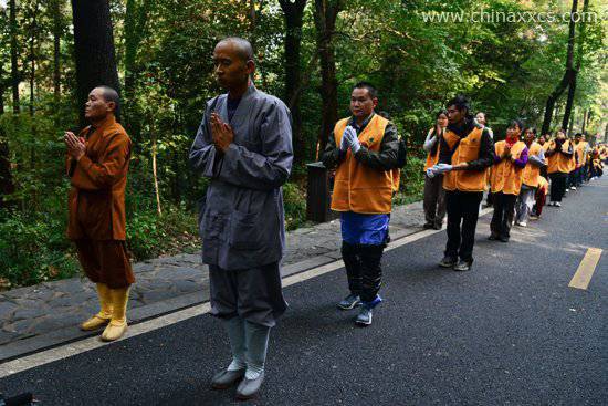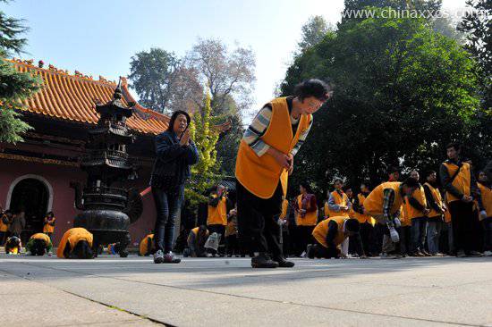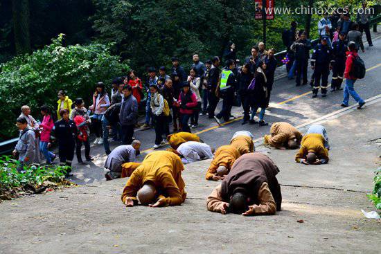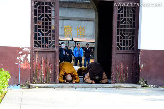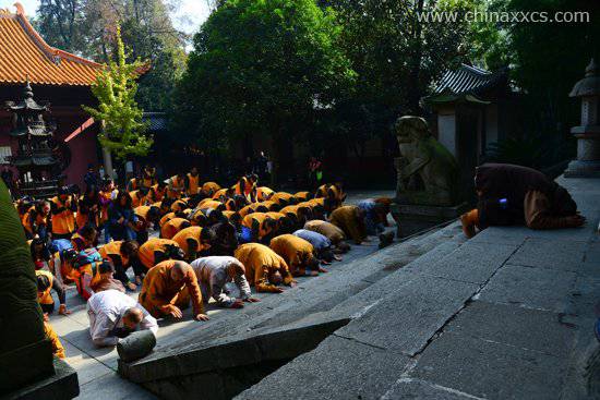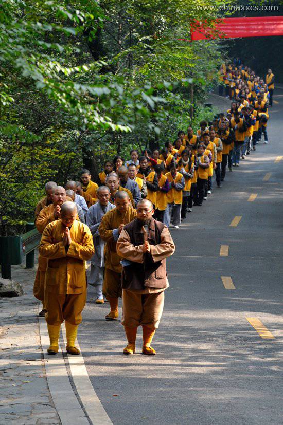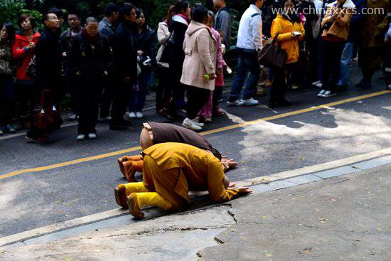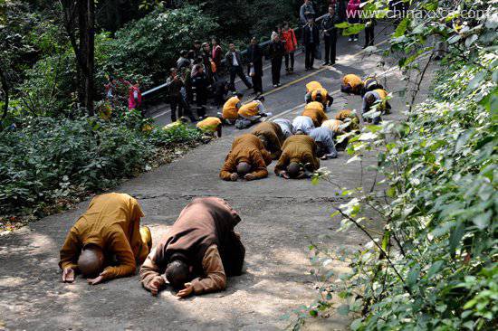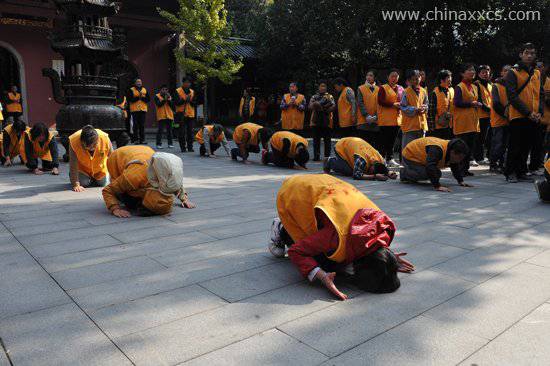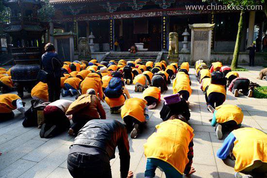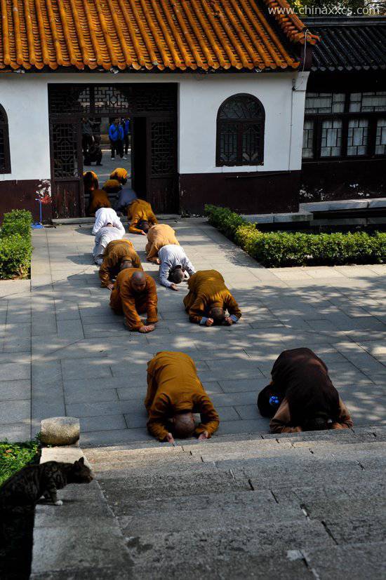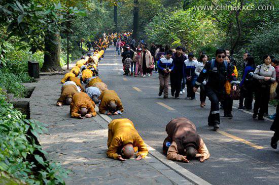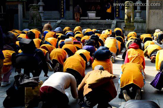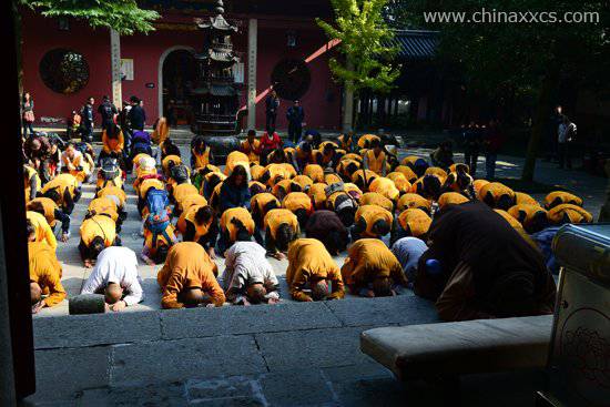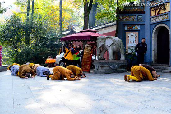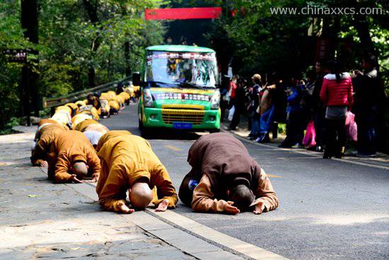 道圆法师和悉正法师领队,合十,虔诚礼拜。长长的队伍,无视周围或好奇或诧异的目光,超然物外,有条不紊地起起落落虔诚跪拜;此刻,世界是那么静谧,静得只听见自己的呼吸和回荡在心底的那一声佛号。