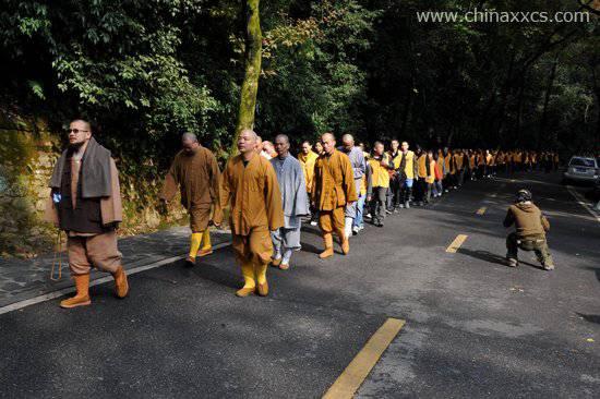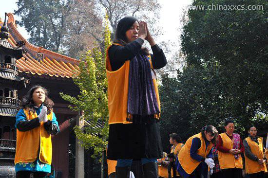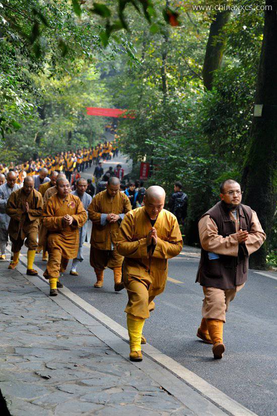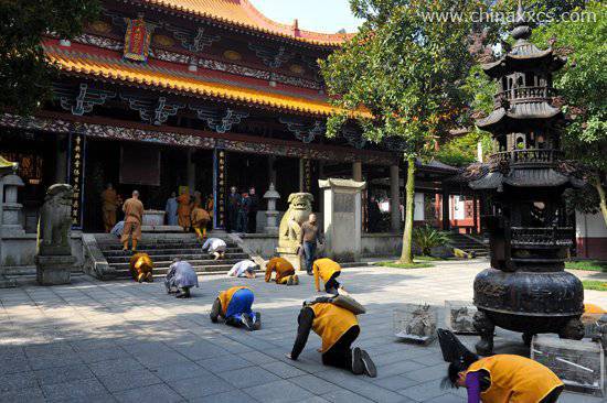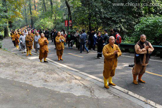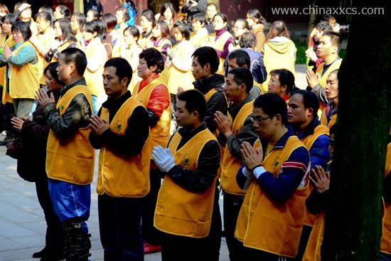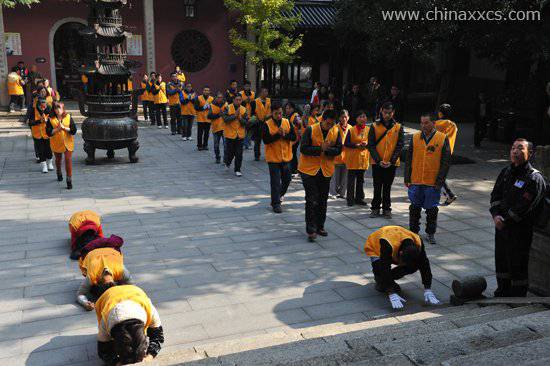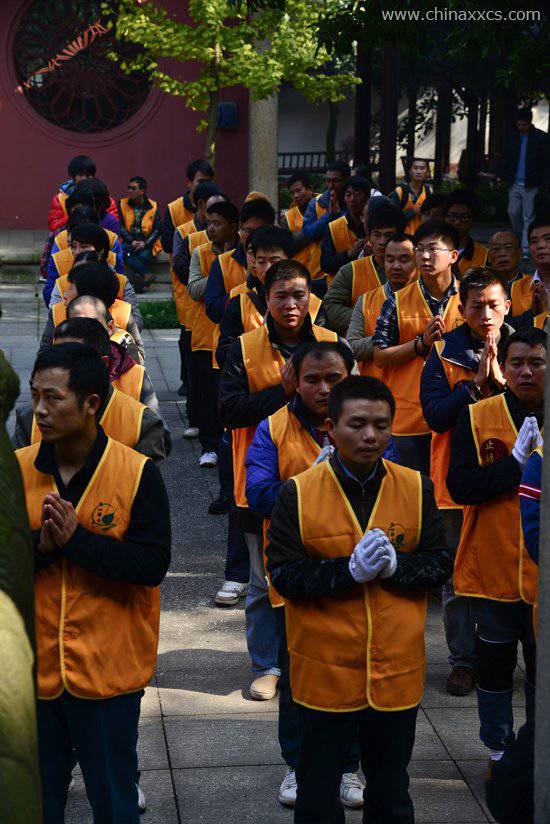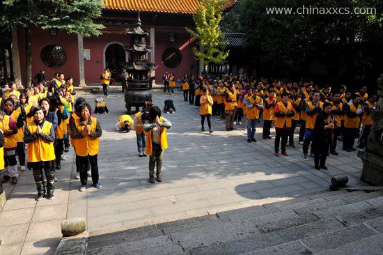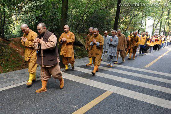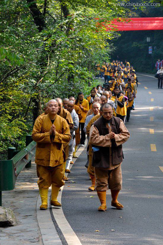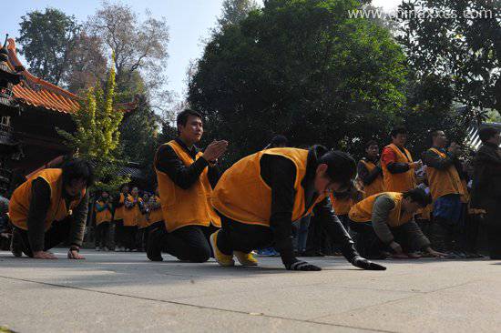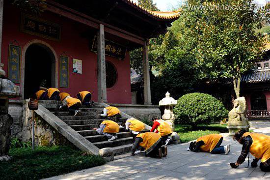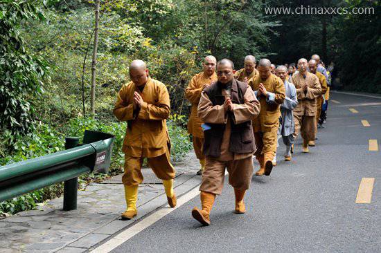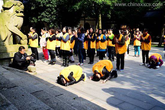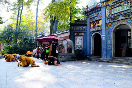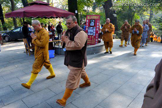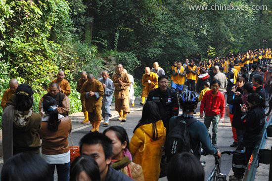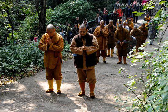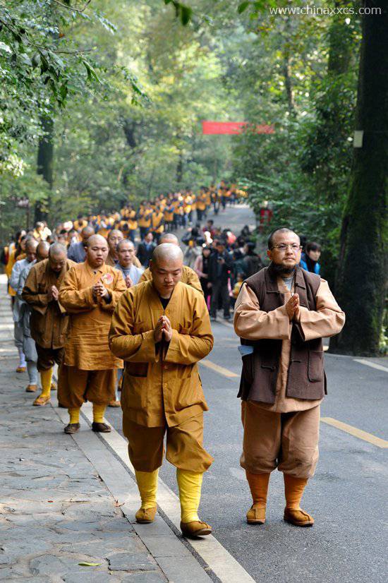 道圆法师和悉正法师领队,合十,虔诚礼拜。长长的队伍,无视周围或好奇或诧异的目光,超然物外,有条不紊地起起落落虔诚跪拜;此刻,世界是那么静谧,静得只听见自己的呼吸和回荡在心底的那一声佛号。