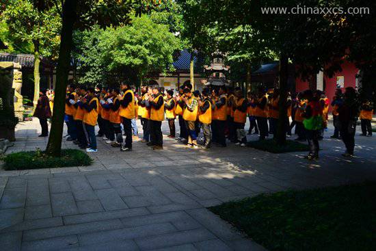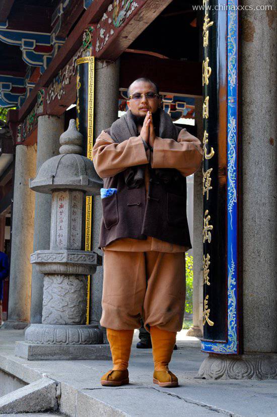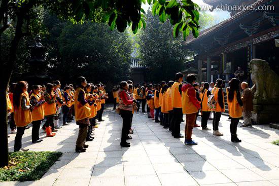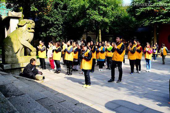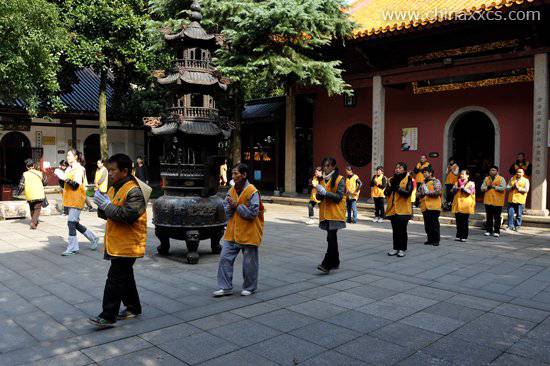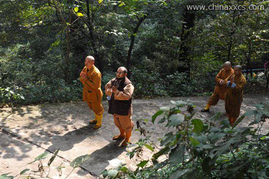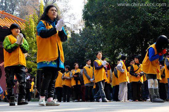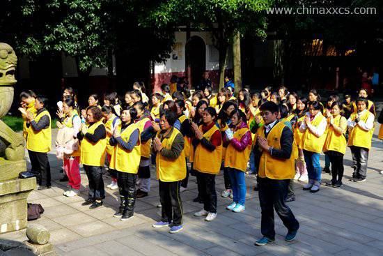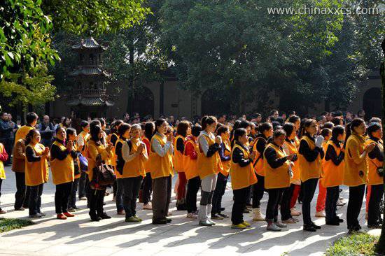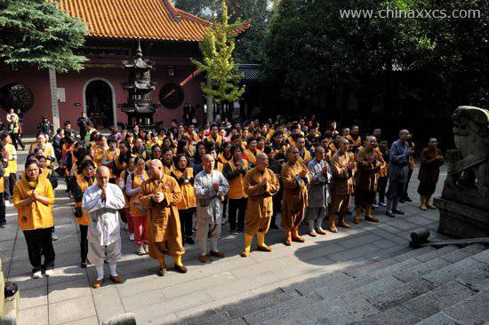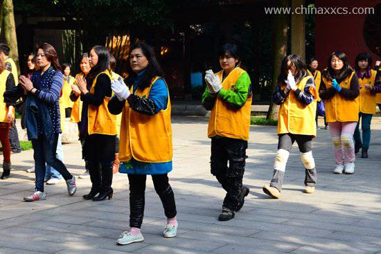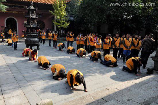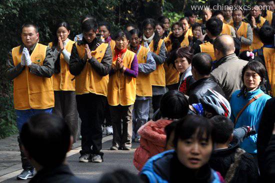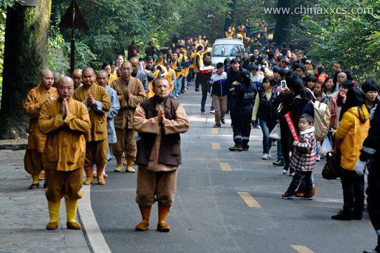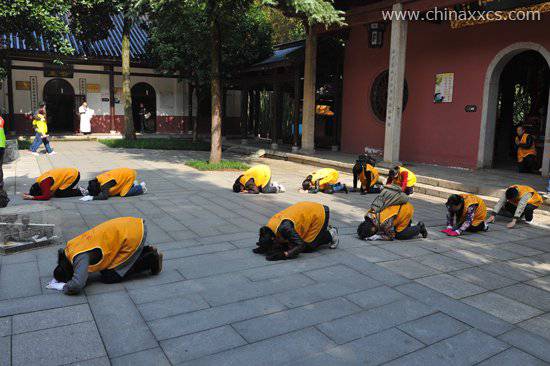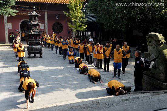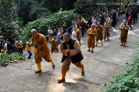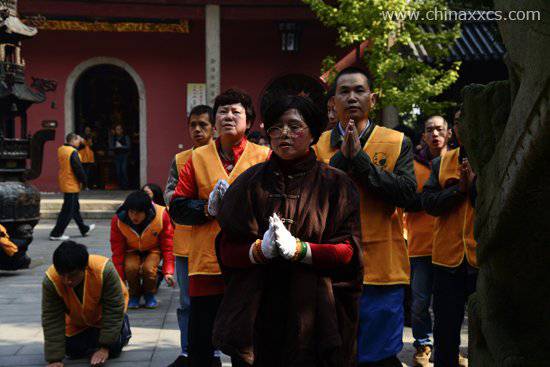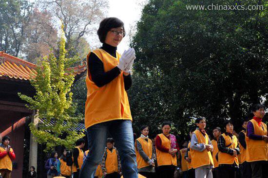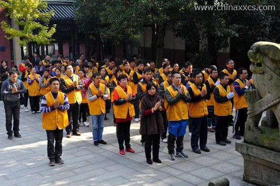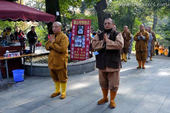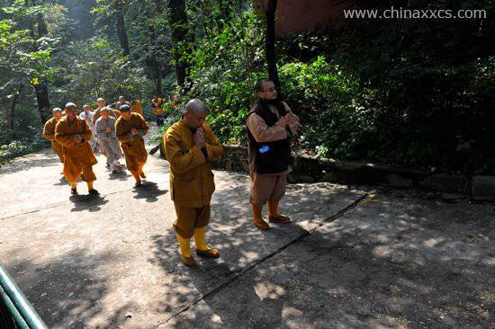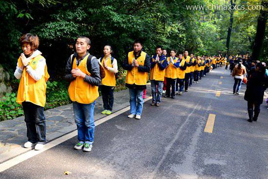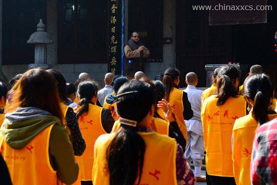 道圆法师和悉正法师领队,合十,虔诚礼拜。长长的队伍,无视周围或好奇或诧异的目光,超然物外,有条不紊地起起落落虔诚跪拜;此刻,世界是那么静谧,静得只听见自己的呼吸和回荡在心底的那一声佛号。