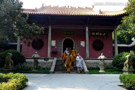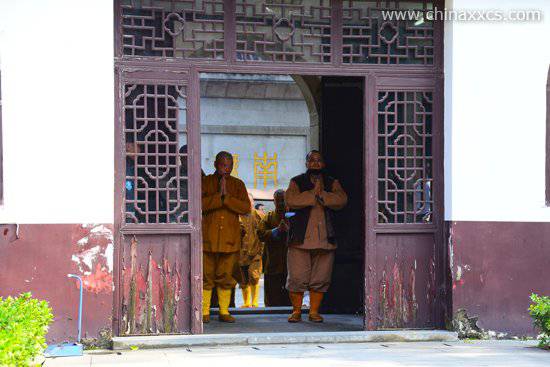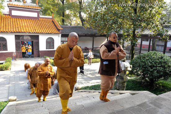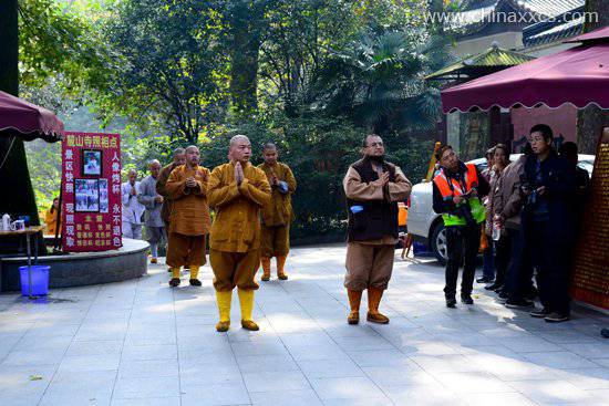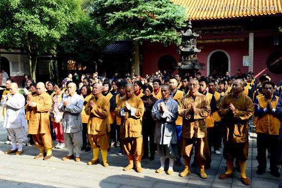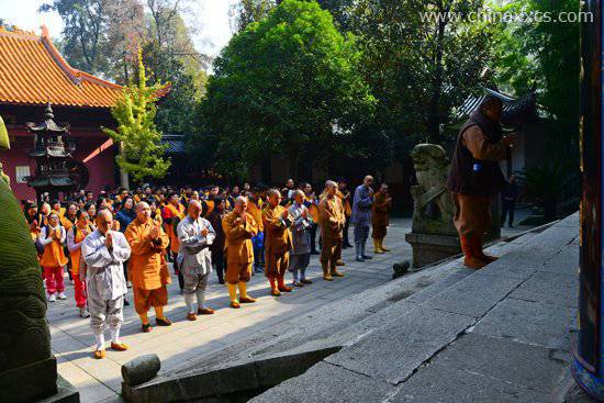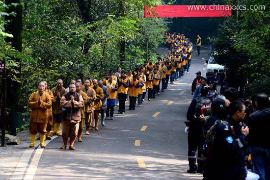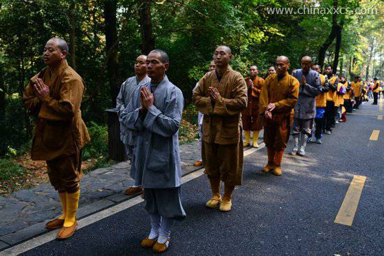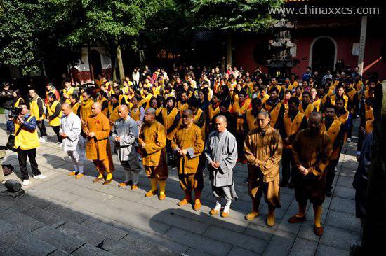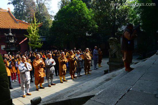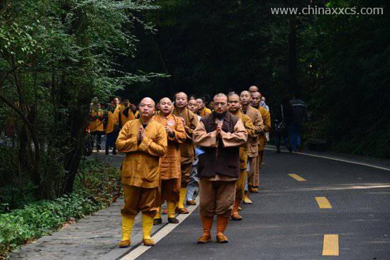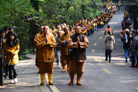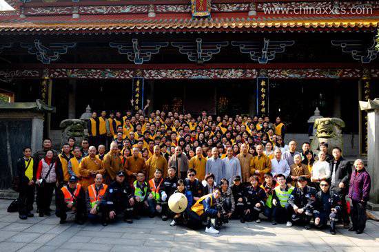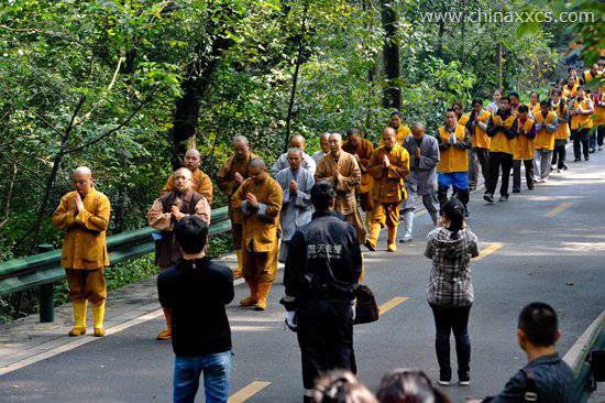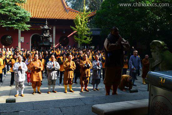 法师们在队伍的前端,义工居士随后,一步三叩拜到达麓山寺内,队伍在麓山寺大雄宝殿汇聚,全体到达后,麓山古寺知客师热情迎候大家。