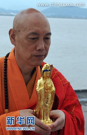 在舟山定海老塘山码头,普陀山佛教协会会长、普济禅寺方丈道慈大和尚手捧观音圣像登上游轮