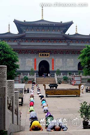 2010年8月17日早上,由中国佛学院悟实法师率领的北京、河北、山东等地信众一行43人,从峨眉山大佛禅院引门大光明楼开始,口诵“南无大行普贤菩萨”,三步一拜,身体力行,朝礼四川峨眉山大佛禅院。 整个朝礼仪式历时4个小时,最后悟实法师带领信众在大雄宝殿长跪合掌回向,共同祝福风调雨顺,国泰民安,正法久住,法轮常转。